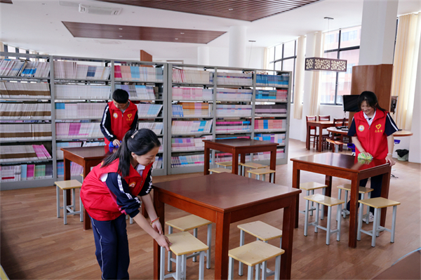 博尔赫斯说,“这世上如果有天堂,应该是图书馆的模样”。学生志愿者们来到学校图书馆帮着图书管理员清扫馆内卫生、分类整理书籍。在当今网络发达的时代,电子书阅读虽然快捷高效,却永远取代不了阅读纸质书的感受,因为时间赋予纸质书独特的墨香、色彩和魅力是无法比拟的。同学们选取一本喜爱的书,坐在图书馆一隅,亲近书香,安静阅读,让身心得到舒展。