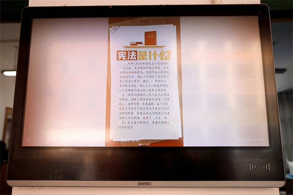 学校充分利用校园宣传阵地,构建起全方位、多层次的宪法宣传网络。校园电子宣传屏持续播放宪法宣传标语,电子班牌展示宪法宣传图片、视频等资料,让宪法知识在课间休息等碎片化时间也能走进学生视野。通过这些举措,校园内迅速营造出浓厚的法治教育氛围,为后续活动的开展奠定了坚实基础。