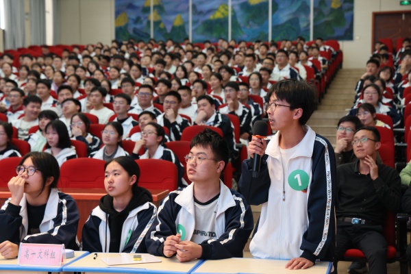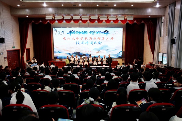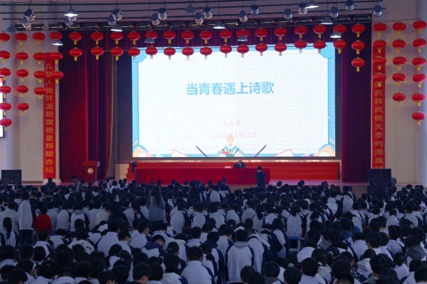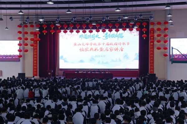 吴允富校长简要介绍了我校扎实推进校园诗教工作的举措与成效。他指出,诗歌节是文峰的品牌文化,也是校园诗教的重要载体。他要求同学们珍惜这次难得的学习机会,认真聆听讲座中丰沛的文学知识和人生感悟,让诗歌之炬点亮春天、照亮未来。最后,吴校长祝愿文峰学子在平仄里读懂热爱,在韵律中找到共鸣,在书香里沉淀底气,在笔墨间舒展胸襟,在逐梦途中书写最美的青春诗章!