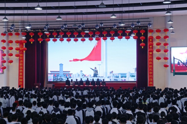 伴随着雄壮的国歌声,鲜艳的五星红旗冉冉升起,全体师生肃立,齐唱国歌、校歌。
