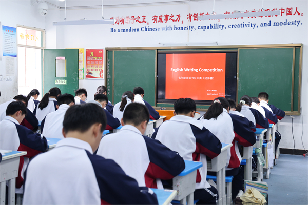 大赛采用“团体赛+个人赛"双轨选拔机制。10月17日,团体赛在各班级教室同步开展,全体七年级学生踊跃参与。同学们个个坐姿端正,神情专注,手中的黑色水笔在英语专用稿纸上沙沙作响,字母圆润饱满,单词间距匀称,展现出扎实的书写功底。经过英语组教师的严格评审,六十名佼佼者脱颖而出,成功晋级个人赛。