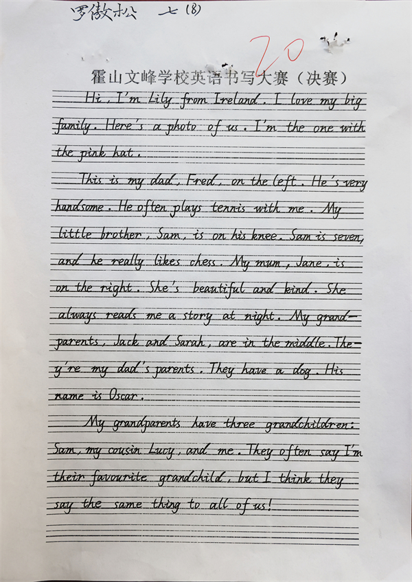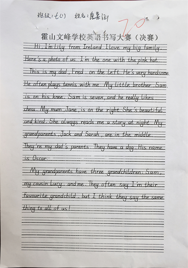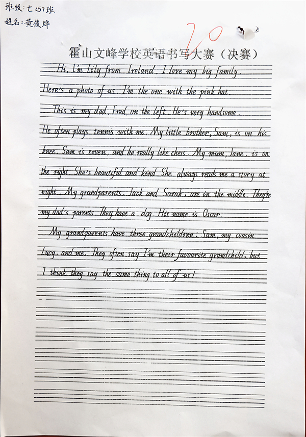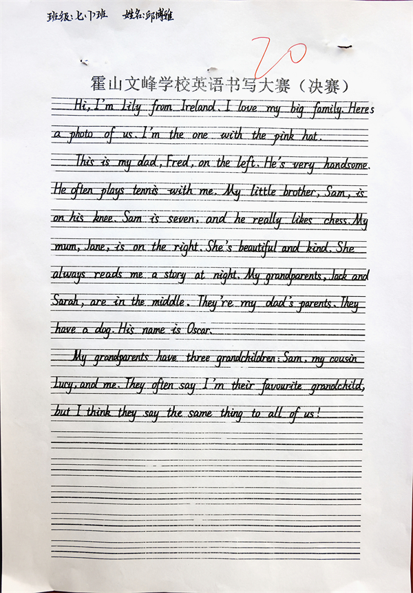 为进一步丰富校园文化内涵,激发学生学习英语的热情,夯实英语书写基本功,霍山文峰学校七年级于近日精心策划并成功举办了一场精彩纷呈的英语书写大赛。本次赛事以"规范书写格式、提升书写技能、涵养审美素养"为宗旨,通过以赛促练的方式,为全校学子搭建了展示书写风采的平台。
